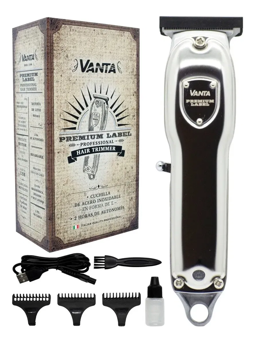 Cuchilla de acero inoxidable en forma T. Potente motor de 220 V - 50 HZ. Batería litio 900mA. 2 horas de autonomía y 2 horas de carga. Incluye: 3 Peines guia ( 1; 2 y 3 mm) + Cable USB para carga + Aceite lubricante para la cuchilla + Cepillo de limpieza